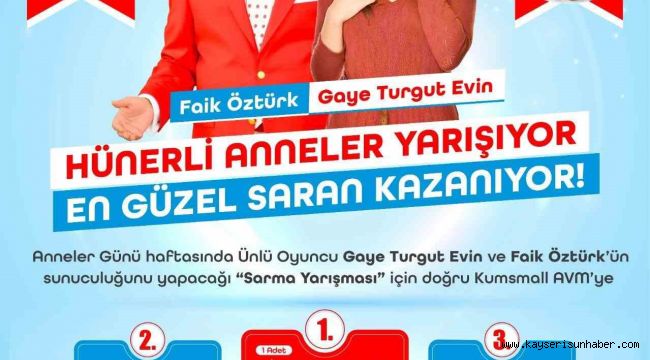 Türkiye ve Avrupa'nın en büyük karma AVM'si olan KUMSMALL AVM, Anneler Günü'ne özel etkinlikte hünerli annelerimizi bir araya getirecek. 13 Mayıs Cumartesi günü yapılacak olan Sarma Yarışması'nın sunuculuğunu Ünlü İsimler Faik Öztürk ve Gaye Turgut Evin üstlenecek.