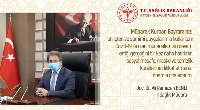 İl Sağlık Müdürü Doç. Dr. Ali Ramazan Benli, "Mübarek Kurban Bayramınızı en içten ve samimi duygularla kutlarken, Covid-19 ile mücadelemizin devam ettiği gerçeğini bir kez daha hatırlatır, sosyal mesafe, maske ve temizlik kurallarına dikkat etmenizi önemle rica ederim" mesajını paylaştı.