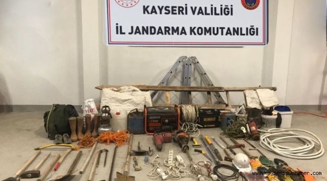 Kayseri'de jandarma ekipleri tarafından yapılan çalışmalarda; kaçak kazı yapan 4 şahıs suçüstü yakalanırken, kazıda kullanılan çok sayıda malzeme ele geçirildi.