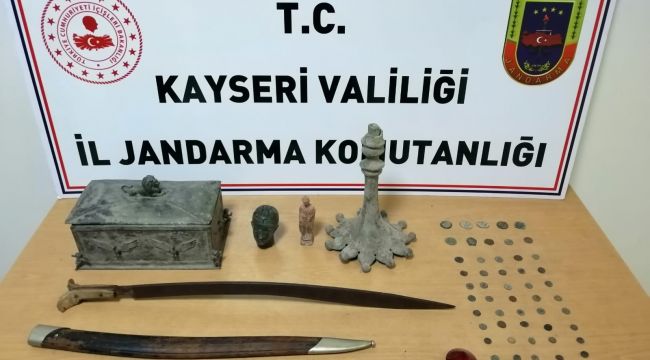 Edinilen bilgiye göre Kocasinan ilçesi Akçatepe mahallesinde jandarma komutanlığı ekipleri tarafından yapılan operasyonda Y.T., C.E.S. ve O.K. yakalandı. Zanlıların iş yerinde yapılan aramalarda, 2 adet kılıç, 1 adet şamdan, 1 adet heykel, 1 adet bronz heykel taşı, 1 adet bronz sandık, 1 adet kırmızı cam obje, 51 adet bronz sikke ele geçirildi.