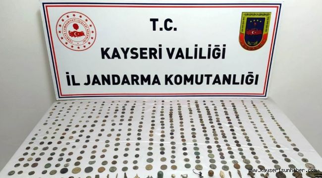 Kayseri İl Jandarma Komutanlığı ekiplerince yapılan çalışmalarda Roma ve Bizans dönemlerine ait olduğu değerlendirilen sikke, obje yüzük ve mühür ele geçirildi.