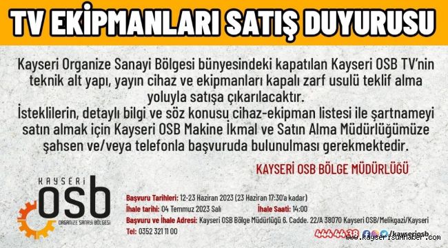 Kayseri Organize Sanayi Bölgesi bünyesinde kurulan ancak yönetim kurulu kararınca kapatılan Kayseri OSB TV'nin teknik alt yapı yayın cihaz ve ekipmanları kapalı zarf usulü teklif alma yoluyla satışa çıkarılacak.