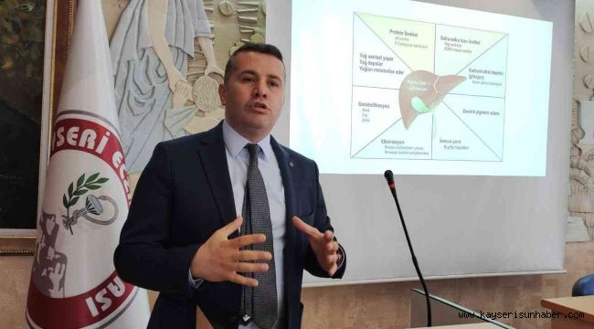 Eczacılar Odası Konferans Salonu'nda gerçekleşen programa, Kayseri Eczacı Odası Başkanı Uğur Nuri Akın, Memorial Kayseri Hastanesi İç Hastalıkları Uzmanı Doç. Dr. Türkmen Bahadır Arıkan ve eczacılar katıldı. Karaciğerin kendi hücresinden oluşan tümörlerin yüzde 80 oranında karaciğerin sağlıksız olmasından kaynaklandığını söyleyen İç Hastalıkları Uzmanı Doç. Dr. Türkmen Bahadır Arıkan, "Karaciğer vücudun sağ üst kadranında ortalama olarak 1 buçuk kilo ağırlığında bir organdır. Vücudun biyokimyasal fabrikasıdır diyebiliriz. Karaciğerimiz, şekerin ilk 24 saat içerisinde kana salınımını yapar. Aminoasitten şeker, şekerden aminoasit ve glikozdan yağların birbirine dönüştürülmesi karaciğer tarafından yapılmaktadır. Birçok ilacın metabolizması karaciğerde olmaktadır. Toksinlerin daha az zararlı toksinlere çevrilmesi ve atılması yine karaciğer tarafından gerçekleştirilmektedir. Özellikle albümin gibi proteinlerin yapımı da karaciğerde bulunmaktadır. Bir diğer önemli fonksiyonu da kanda pıhtılaşmayı sağlayan proteinlerin yapımının da yine karaciğer tarafından gerçekleştirilmesidir. Sirozda karaciğer çalışmamaktadır. Karaciğer çalışmadığı zaman proteinler üretilememekte ve vücutta sıvı toplanması olmaktadır. Proteinleri üretemediği için amonyak birikimi olmaktadır. Bundan dolayı da kanamaya eğilim artmaktadır. Çünkü pıhtılaşma proteinlerini yapamamaktadır. Karaciğer kitleleri iyi huylu ve kötü huylu olmak üzere 2'ye ayrılır. İyi huylu karaciğer kitleleri hemanjiyom, adenom ve fokal nodüler hiperplazi dediğimiz 3 sıkça görülen kitledir. Hemanjiyom, fokal nodüler hiperplazi dediğimiz kitleler önemli bir sıkıntı oluşturmazlar. Sadece bunları diğerlerinden ayırmak için önemlidirler. Adenom dediğimiz iyi huylu kitle ise kadınlarda sıklıkla gözlenir. Bunun hem kanama hem de kansere dönüşme tehlikesi vardır. O yüzden karaciğerdeki kitlelerin en azından adının değerlendirilmesi son derece önemlidir. Karaciğer kanserinin şikayetleri kilo kaybı, sağ üst kadranda ağrı, eğer ki safra yollarına baskı varsa sarılık olabilir. Bu şikayetlerle gidilen bir doktorda ultrason veya tomografi görüntülemesiyle kanseri çağrıştıran bir görsel göz önüne geliyorsa biz bunları malign kitleler olarak değerlendiriyoruz. Karaciğerin kendi hücresinden kaynaklı olan tümörler yüzde 80 oranında karaciğerin sağlıksız olmasından kaynaklanıyor" ifadelerini kullandı. Karaciğerde olduğu gibi pankreasta da hastalıkların iyi ve kötü huylu olarak ikiye ayrıldığını ifade eden Arıkan, sözlerine şu şekilde devam etti;