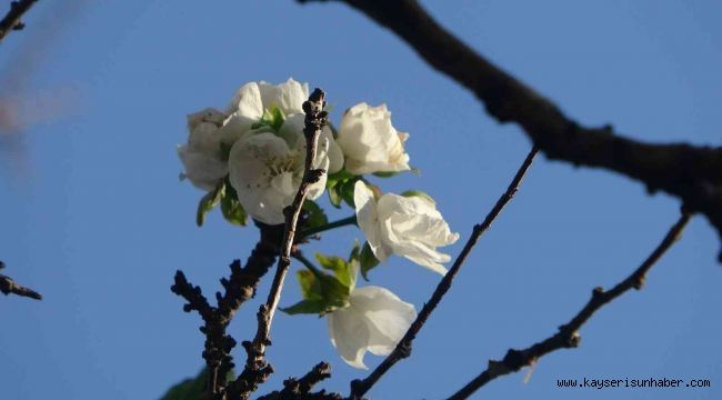 Kayseri'de bir işletmenin bahçesinde bulunan kayısı ağacı, hava sıcaklılarından dolayı Sonbaharda çiçek açtı.