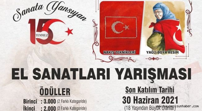 Kayseri Büyükşehir Belediyesi, Kayseri Mesleki Eğitim ve Kültür A.Ş. (KAYMEK) tarafından düzenlenen 15 Temmuz'un millî ve manevi ruhunu yansıtan yağlı boya resim ve nakış teknikleri sanatlarının yer alacağı 'Sanata Yansıyan 15 Temmuz El Sanatları' yarışmasına başvurular başladı.