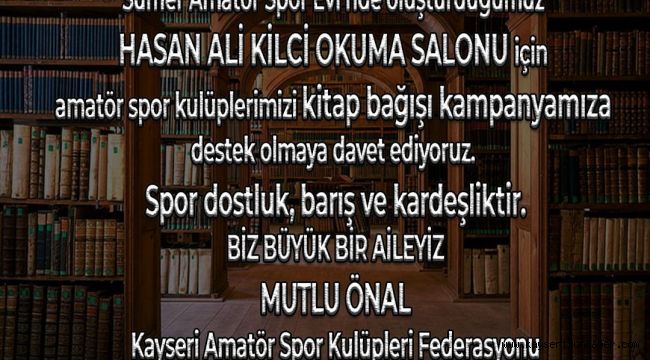 Kayseri Amatör Spor Kulüpleri Federasyonu, (ASKF) Sümer Amatör Evi bünyesinde oluşturulacak olan okuma salonu için kitap toplama kampanyası başlattı.
