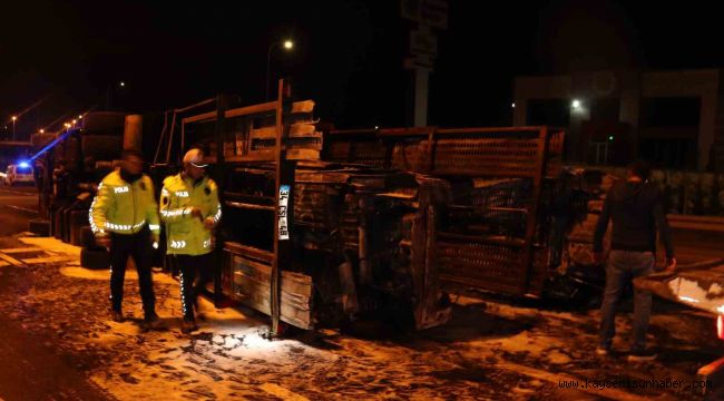 Kayseri'nin Melikgazi ilçesinde çekiciyle çarpışan tır yan yattıktan sonra alev aldı. Kazada sürücüler yaralanırken, tırın üzerinde bulunan 3 otomobil yanarak hasar gördü.