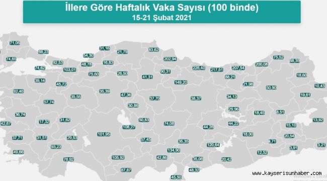 Sağlık Bakanlığı'nın Türkiye genelinde yayınladığı verilere göre Kayseri'de haftalık olarak 100 binde 74,8 olarak belirlendi. 1 milyon 421 bin 455 nüfuslu olan şehirde haftalık vaka oranı 1053, günlük ortalama vaka oranı ise 150 olarak açıklandı.