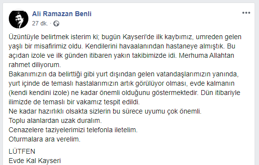 “Bugün Kayseri'de ilk kaybımız, yaşlı bir umreci misafirimiz oldu. Kendilerini direkt havaalanından hastaneye almış idik. Bu açıdan izole ve ilk günden itibaren yakın takibimizdeydi. Misafirimize Allah'tan rahmet diliyorum. Bakanımızın da belirttiği gibi yurt dışından gelen vatandaşlarımızın yanında, yurt içinde de temaslı hastalarımızın artık görülüyor olması evde kalmanın (kendi kendini izole) ne kadar önemli olduğunu göstermektedir. Dün itibariyle ilimizde de temaslı bir vakamız tespit edildi. Ne kadar hazırlıklı olsak da sizlerin bu sürece uyumu çok önemli. Toplu alanlardan uzak duralım. Cenazelere taziyelerimizi telefonla iletelim. Oturmalara ara verelim. Lütfen evde kal Kayseri.”