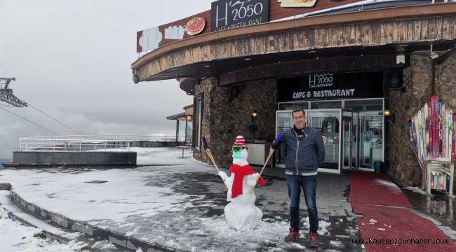 Gece saatlerinden bu yana Türkiye'nin en önemli kış turizm merkezlerinden olan Erciyes Dağı'nda kar yağışı etkili oldu. Bazı noktalarda kar kalınlığı 10 santime kadar ulaşırken, sezonun ilk kardan adamı da yapıldı. Hacılar Kapı'nın 2 bin 650 metre yükseklikte bulunan H2650 Kafe Sahibi Ahmet Köksoy, sabah işyerini açmaya geldiklerinde muhteşem bir manzarayla karşılaştıklarını söyledi. Yağan karı değerlendirerek şehrin ilk kardan adamını yaptıklarını belirten Köksoy, "Dün akşamdan bu yana yağan kar yağışı nedeniyle sabah Hacılar Kapı'daki restoranımızı açmaya geldiğimizde muhteşem bir manzarayla karşılaştık. Yer yer 10 santime kadar kar olmuş. Bunu da fırsata çevirelim dedik, kardan adamımızı yaptık. Misafirlerimizin de ilgisini çekiyor, Kayseri'nin ilk kardan adamı" ifadelerini kullandı.