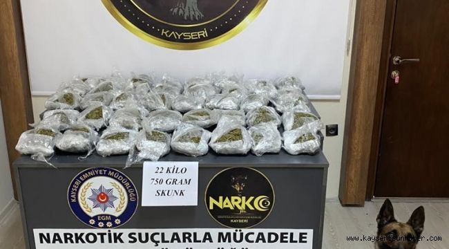 Kayseri İl Emniyet Müdürlüğü Narkotik Suçlarla Mücadele Şube Müdürlüğü ekiplerince şüphe üzerine durdurulan otomobilde 22 kilo 750 gram uyuşturucu ele geçirildi.