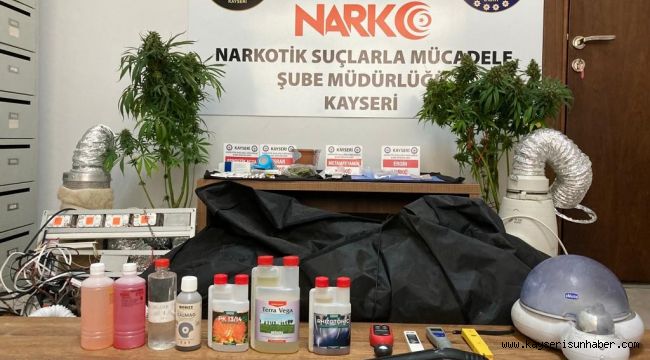 Edinilen bilgiye göre, Kayseri İl Emniyet Müdürlüğü Narkotik Suçlarla Mücadele Şube Müdürlüğü ekipleri, M.G.'nin uyuşturucu madde ticareti ve uyuşturucu madde imali yaptığı bilgisi üzerine harekete geçti. Şahsın adresini tespit eden ekipler, düzenledikleri operasyonda çeşitli miktarlarda uyuşturucu madde ile 1 adet hassas terazi, esrar bitkisi imalatı için düzenek ve düzenek içerisinde 1 adet ışık ölçer cihaz, 1 adet güneş ışığından korumak için çadır, 1 adet ölçüm cihazı, 15 adet fan, 9 adet LED ışık, 3 adet alüminyum havalandırma borusu, 1 adet nemlendirme cihazı, 7 adet kenevir bitkisi yetiştirme amaçlı kimyasal ilaç, 1 adet ruhsatsız av tüfeği ve 2 adet kartuş ele geçirdi. Operasyon çerçevesinde 2 şüpheli hakkında işlem yapılırken, M.G. gözaltına alındı.