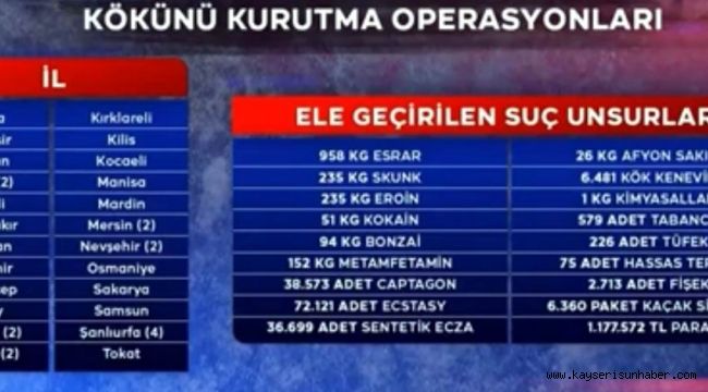 Türkiye genelinde 24 ilin yaptığı Kökünü Kurutma Operasyonlarında; Kayseri Narkotik Suçlarla Mücadele Şube Müdürlüğü ekipleri 2 büyük operasyon yaparak uyuşturucu ile mücadelede Türkiye sıralamasında ilk 4 ilden biri olma başarısını sağladı.