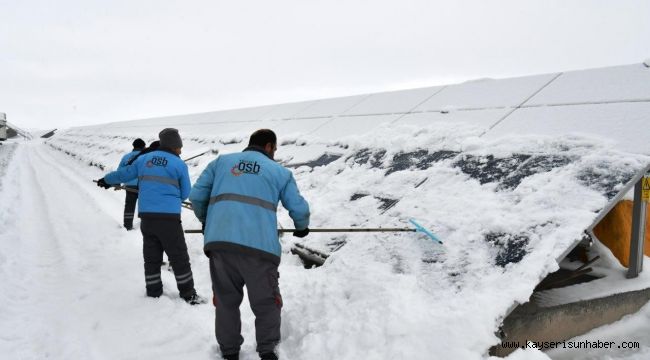 Kayseri Organize Sanayi Bölgesi'nin ülkemize kazandırdığı önemli yatırımlardan olan Güneş Enerji Santrali'ndeki paneller yoğun kar yağışı nedeniyle sürekli temizleniyor. Panellerdeki karın temizlenmesiyle elektrik üretiminde devamlılık sağlanıyor.