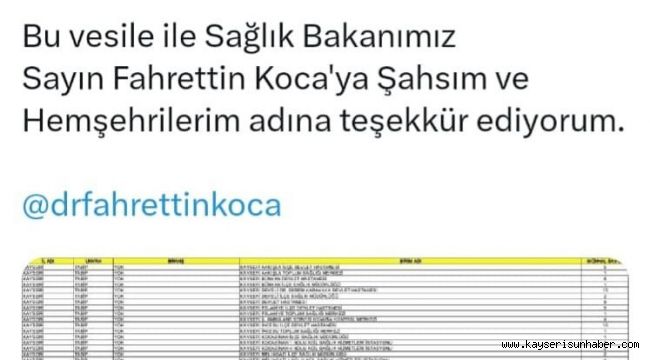 "Sağlık Bakanlığımız nezdinde Kayseri ve ilçelerinde ihtiyaç olan tüm branşlardan 187 hekim kadrosu tahsis edildi. Bu vesile ile Sağlık Bakanımız Fahrettin Koca'ya şahsım ve hemşehrilerim adına teşekkür ediyorum."