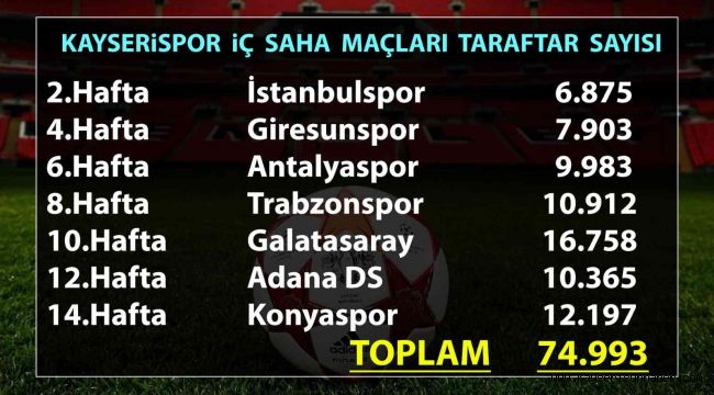 Süper Lig'de mücadele veren Yukatel Kayserispor, geride kalan 14 haftalık dilimde sahasında 7 müsabakaya çıktı. İstanbulspor, Giresunspor, Antalyaspor, Trabzonspor, Galatasaray, Adana Demirspor ve Konyaspor ile sahasında 3 puan mücadelesi veren Kayserispor, bu maçlarda tribüne 74 bin 993 futbolseveri çekti. Kayserispor, en çok taraftarı ligin 10.haftasında sahasında oynadığı Galatasaray maçında çekti. Bu müsabakayı 16 bin 758 kişi statta izledi. Kayserispor'un iç sahada oynadığı maçlarda tribüne gelen taraftar sayıları şu şekilde;