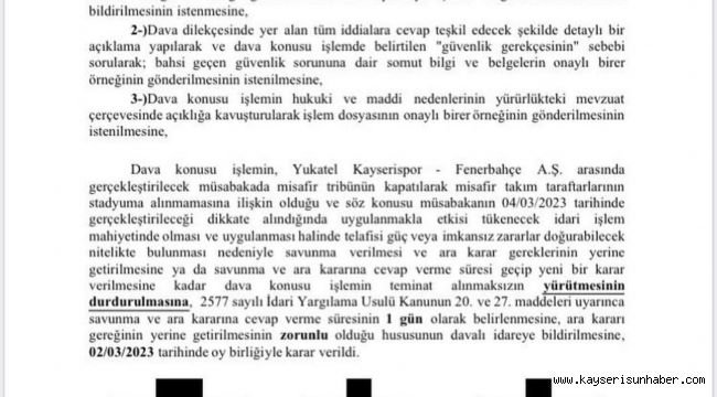 Kayseri 2. İdare Mahkemesi'nin kararında, "Dava konusu işlemin Kayserispor-Fenerbahçe arasında gerçekleştirilecek müsabakada misafir tribünün kapatılarak, misafir takım taraftarlarının stadyuma alınmamasına ilişkin olduğu ve söz konusu müsabakanın 4 Mart'ta gerçekleştirileceği dikkate alındığında uygulanmakla etkisi tükenecek idari işlem mahiyetinde olması ve uygulanması halinde telafisi güç veya imkansız zararlar doğurabilecek nitelikte bulunması nedeniyle savunma verilmesi ve ara karar gereklerinin yerine getirilmesine ya da savunma ve ara kararına cevap verme süresi geçip yeni bir karar verilmesine kadar dava konusu işlemin teminat alınmaksızın yürütmesinin durdurulmasına, 2577 sayılı İdari Yargılama Usulü Kanunu'nun 20. ve 27. maddeleri uyarınca savunma ve ara kararına cevap verme süresinin 1 gün olarak belirlenmesine, ara kararı gereğinin yerine getirilmesinin zorunlu olduğu hususunun davalı idareye bildirilmesine oy birliğiyle karar verildi" denildi.