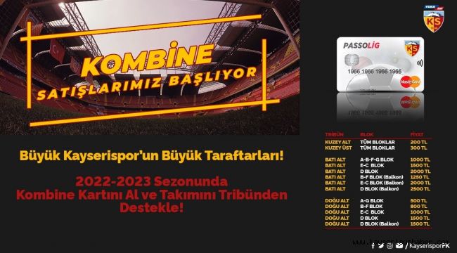 Yukatel Kayserispor Kulübü, Süper Lig 2021-2022 sezonunda geçerli olmak üzere kombine bilet satışı başlatacağını duyurdu. Sarı kırmızılı kulüpten yapılan açıklamada; "YukatelKayserispor'umuzun Süper Lig 2022-2023 Sezonunda geçerli olacak kombine satışları 4 Temmuz Pazartesi günü saat 14.00 itibariyle başlıyor" ifadelerine yer verildi. Kayserispor Kombine fiyatları şu şekilde: