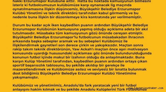 Açıklamanın devamında "Durum bu kadar açık iken kaybedilen puanın ardından Büyükşehir Belediye Erzurumspor Kulübünün kamuoyuna yapmış olduğu açıklama adeta bir akıl tutulmasıdır. Müsabaka tüm kamuoyunun gözü önünde cereyan etmiştir. Büyükşehir Belediye Erzurumspor'lu futbolcunun müsabakadan ihracının arkasında başka sebepler aramak ve bu sebepleri Kulübümüz ile ilişkilendirmek gayretleri son derece çirkin ve yakışıksızdır. Maçtan sonra rakip takım teknik direktörünün, Yaw Ackah'ı maçtan önce aşırı motivasyon konusunda uyardığı hususundaki açıklaması göz önünde bulundurulduğunda konunun futbol içinde makul bir izahının olduğu da anlaşılmaktadır. Buna karşın Kulüp Yönetimi tarafından, kaybedilen puanın ardından ortaya çıkan sportif başarısızlık tablosunu, bu şekilde akıldışı bir gerekçe ile mazeretlendirmek ve Kulübümüze asılsız ve seviyesiz bir isnatta bulunmak dost bildiğimiz Büyükşehir Belediye Erzurumspor Kulübü Yönetimine yakışmamıştır. Kulübümüz ve yönetimimiz, Anadolu'da fark oluşturacak yeni bir futbol anlayışını hakim kılmak ve bu şekilde Anadolu Kulüplerini Türk Futbolunda layık oldukları yerde tutmak gayret ve çabasındadır. Bu amaçla başta ekonomik bağımsızlık olmak üzere kurumsallaşmış bir kulüp düzeni oluşturmanın mücadelesini vermektedir. Vizyonumuz ve anlayışımız, sportif performansın, olumsuz sonuçlarına bertaraf etmek uğruna kısır, temelsiz ve futbola zarar veren tartışmalardan uzak durmayı gerektirmektedir. Bununla birlikte yönetimimiz, kişisel ikballeri için kulüp tarihimize ve sporcularımızın emeğine kara leke sürmek isteyenlerle anladıkları dilden mücadele etmeyi de bilmektedir. Bu doğrultuda Büyükşehir Belediye Erzurumspor Kulübü Yönetimini yetkili ve görevli merciler önünde iddialarını ispata davet ediyoruz. Ayrıca bilinmesini isteriz ki Kulübümüz de iftira mahiyetindeki bu eylem ve söylemlere karşı doğmuş ve doğacak her türlü talep ve başvuru hakkını son dereceye kadar kullanacak, sportif başarısızlıklarını rakiplerine karşı iftirada bulunarak örtmek isteyen sorumsuz kulüp yöneticilerine karşı layık oldukları şekilde hukuki süreçleri işletecektir" cümlelerine yer verildi.