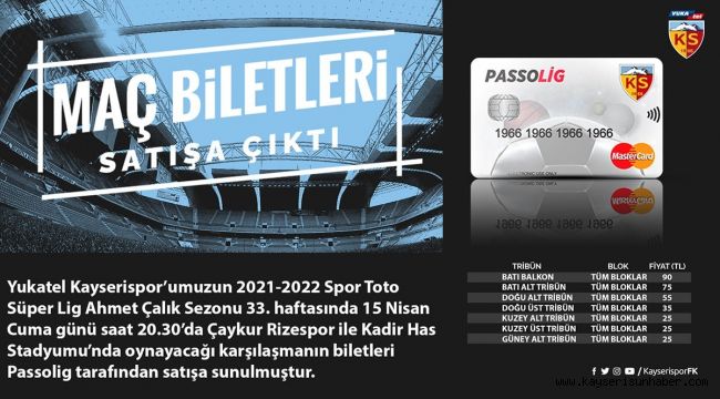 Süper Lig'in 33. haftasında Kadir Has Stadı'nda oynanacak Kayserispor-Çaykur Rizespor maçının bilet fiyatları belli oldu. Kayserispor kulübü tarafından yapılan açıklamaya göre, bilet fiyatları 25 TL ila 90 TL arasında satışa çıkarıldı. Kayserispor Başkanı Berna Gözbaşı, Rizespor maçında taraftar desteğini tribünde hissetmek istediklerini ifade ederek, "Taraftarımızın desteğini görmek istiyoruz. Taraftarımız ile bütünleşip 3 puanı almak istiyoruz" dedi.