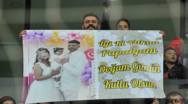 Süper Lig ekiplerinden Kayserispor taraftarları, tribünde renkli görüntüler oluşturuyor. Ligin 11. haftasında oynanan Kayserispor - Corendon Alanyaspor maçında Kayserispor taraftarı Anıl Aydın Katipoğlu, eşinin doğum gününü tribünde kutladı. Eşi Sevim ve kızları Tülay Ece'nin fotoğrafını pankarta bastıran Anıl Aydın Katipoğlu; 'İyi ki varsın papatyam, doğum günün kutlu olsun' yazısıyla eşinin doğum gününü kutladı. Katipoğlu'nun pankartlı kutlaması, tribünden alkış aldı.