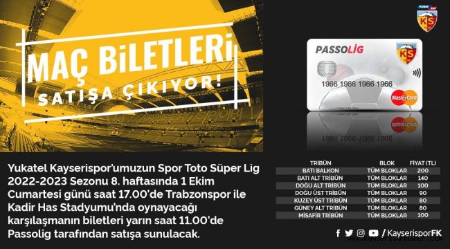 Kayserispor Kulübü, 1 Ekim Cumartesi günü saat 17.00'de RHG Enertürk Enerji Stadyumu'nda oynanacak Trabzonspor maçının bilet fiyatlarını belirledi. Sarı kırmızılı kulüpten yapılan açıklamaya göre bilet fiyatları 200 ile 80 TL arasında değişiyor. Yarın saat 11:00'de satışa çıkacak bilet fiyatları ise şu şekilde;