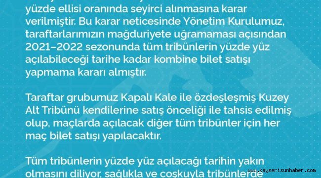 Yukatel Kayserispor kulübünden yapılan açıklamada "Büyük Kayserispor taraftarı; bilindiği üzere Süper Lig'de 2021-2022 sezonu öncesi Türkiye Futbol Federasyonu tarafından tribünlerin yüzde ellisi oranında seyirci alınmasına karar verilmiştir. Bu karar neticesinde yönetim kurulumuz taraftarlarımızın mağduriyete uğramaması açısından 2021-2022 sezonunda tüm tribünlerin yüzde yüz açılabileceği tarihe kadar kombine bilet satışı yapmama kararı almıştır. Taraftar grubumuz Kapalı Kale ile özdeşleşmiş Kuzey alt tribünü kendilerine satış önceliği ile tahsis edilmiş, olup maçlarda açılacak diğer tüm tribünler için her maç bilet satışı yapılacaktır. Tüm tribünlerin yüzde yüz açılacağı tarihin yakın olmasını diliyor, sağlıklı ve coşkuyla tribünlerde bulacağımız günü bekliyoruz" denildi.