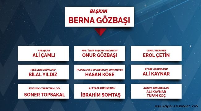 Geçtiğimiz aylarla yapılan Olağan Genel Kurul toplantısı ile güven tazeleyen Yukatel Kayserispor Başkanı Berna Gözbaşı, yeni ekibine görev dağılımı yaptı. Kadir Has tesislerinde gerçekleştirilen toplantıda görev dağılımı şu şekilde oldu: