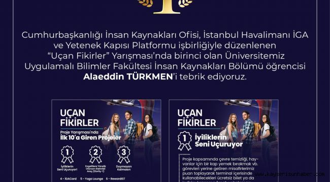 Kayseri Üniversitesi (KAYÜ) Uygulamalı Bilimler Fakültesi İnsan Kaynakları Yönetimi Bölümü 3. sınıf öğrencisi Alaeddin Türkmen, Cumhurbaşkanlığı İnsan Kaynakları Ofisi, İstanbul Havalimanı İşletmesi İGA ve Yetenek Kapısı Platformu işbirliğiyle düzenlenen Uçan Fikirler Yarışmasında "İyiliklerin Seni Uçuruyor" adlı projeleri ile takım arkadaşıyla birlikte birinci oldu.