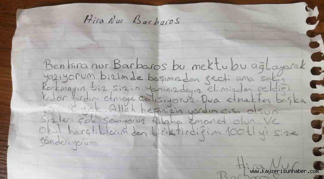 7 yaşındaki Hira Nur Barbaros, bağışladığı para ile birlikte yazdığı mektupla da duygulandırdı. Küçük kız mektubunda, "Ben Hira Nur Barbaros. Bu mektubu ağlayarak yazıyorum. Bizim de başımızdan geçti ama sakın korkmayın, biz sizin yanınızdayız. Elimizden geldiği kadar yardım etmeye çalışıyoruz. Dua etmekten başka çaremiz yok. Allah hepinizin yardımcısı olsun. Sizleri çok seviyoruz. Allah'a emanet olun ve okul harçlıklarımdan biriktirdiğim 100 TL'yi size gönderiyorum" ifadelerini kullandı.