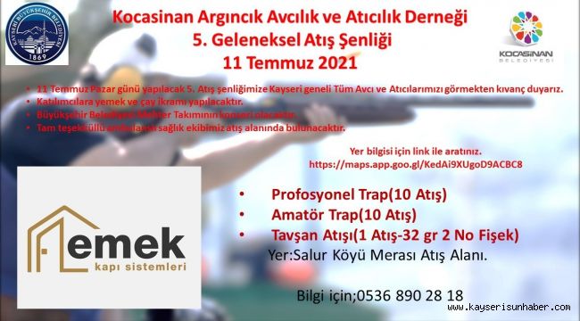 Kocasinan Argıncık Avcılık ve Atıcılık Derneği tarafından geleneksel olarak düzenlenen Atış Şenliği'nin 5.'si Salur Köyü Merası Atış Alanı'nda 11 Temmuz Pazar günü yapılacak.