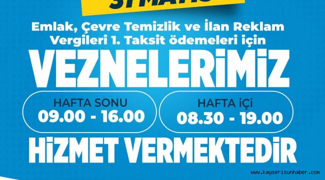 Vergi ödemelerinde her türlü ödeme kolaylığı sunan Kocasinan Belediyesi; Emlak, Çevre Temizlik ve İlan Reklam vergilerini ödemek isteyen mükellefler için hafta sonu 27 Mayıs Cumartesi ve 28 Mayıs Pazar günü saat 09:00 ile 16:00 saatleri arası, hafta içi ise 29-30-31 Mayıs Çarşamba Günü saat 08:30 ile 19:00 saatleri arası veznelerin açık olacağı duyuruldu.