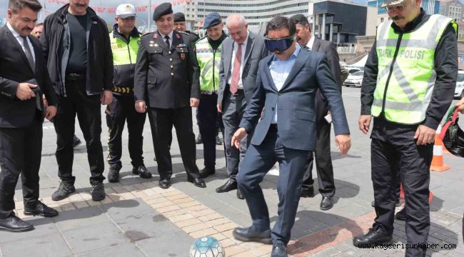 Kayseri'de Trafik Haftası nedeniyle düzenlenen etkinlikte kurşunlanan trafik levhaları sergilenirken, Kayseri Valisi Gökmen Çiçek farkındalık oluşturmak amacıyla alkol simülasyon gözlüğü takarak, kaleye şut çekti.