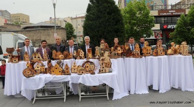 Kayseri Gençlik Merkezi Ahşap Sanatları Atölyesi bünyesinde Gönüllü Eğitmen Cuma Atılgan ve gönüllü gençler tarafından yapılan Kuş Evleri, 15 Mayıs Gençlik Haftası açılış töreninde sergilendi.