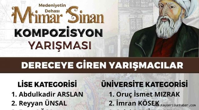 Büyükşehir Belediyesi'nin kültür sanat etkinlikleri çerçevesinde düzenlediği, Kayseri'nin bağrından çıkıp, tüm dünyaya örnek olan Mimar Sinan'ı anlatacak "Medeniyetin Dehası Mimar Sinan" adlı kompozisyon yarışmasının kazananları belli oldu. 218 gencin katıldığı yarışmada lise ve üniversite kategorisinde jürinin değerlendirmesi sonucu dereceye girenler belirlendi.