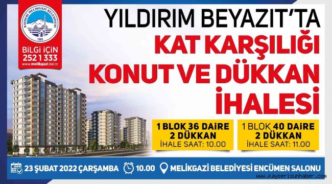 Melikgazi Belediye Başkanı Dr. Mustafa Palancıoğlu, Yıldırım Beyazıt Mahallesi'nde 1 blok 36 daire 2 dükkân ve 1 blok 40 daire 2 dükkân için ihale yapılacağını söyledi. hale 23 Şubat Çarşamba günü saat 10.00'da yapılacak.