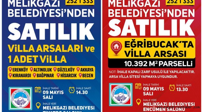 Melikgazi Belediye Başkanı Dr. Mustafa Palancıoğlu, mülkiyeti belediyeye ait olan Eğribucak Mahallesi'nde bulunan villa arsası ve Erenköy, Altınoluk, Güzelköy, Akkaya, Kıranardı, Bağpınar, Hisarcık, Becen Mahallesinde ihale ile villa arsası ve 1 adet villanın satışının yapılacağını söyledi.