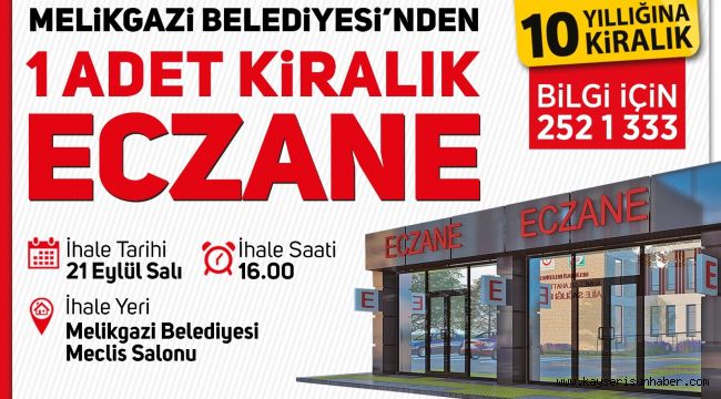 Mülkiyeti Melikgazi Belediyesi'ne ait olan 1 adet eczane 21 Eylül Salı günü açık artırma usulüyle 10 yıllığına kiraya verilecek.