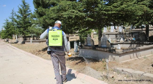 Melikgazi Belediyesi ekiplerince temizlenerek, daha güzel bir görünüme kavuşturulan mezarlıkları Kurban Bayramı'na hazırlayan belediye ekipleri, mezarlıklarda kuruyan otlar, dikenler, atılan çöp ve katı atıkları temizlendi.