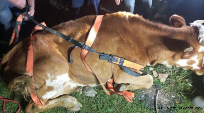 Menfeze sıkışan büyükbaş hayvan 2 saatlik operasyonla kurtarıldı