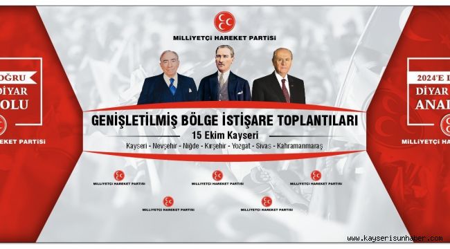 MHP Genişletilmiş Bölge İstişare Toplantısı, Kayseri, Nevşehir, Niğde, Kırşehir, Yozgat, Sivas, Kahramanmaraş teşkilatlarının katılımı ile Kayseri'de yapılacak. MHP Kayseri İl Başkanlığı'ndan yapılan açıklamada, vatandaşlar toplantıya davet edilerek, "Genel Başkanımız Sayın Devlet Bahçeli'nin talimatlarıyla '2024'e Doğru Diyar Diyar Anadolu' temalı Genişletilmiş Bölge İstişare toplantımız 15 Ekim Pazar Günü gerçekleştirilecektir. Siz kıymetli basın mensuplarının da katılımlarını bekler, iyi çalışmalar dileriz" denildi.