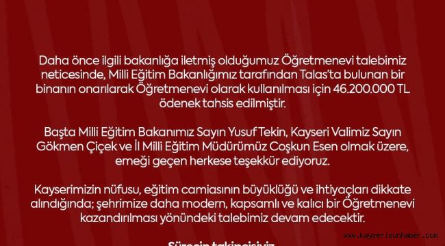 "Hayırlı olsun Kayserim. Daha önce ilgili bakanlığa iletmiş olduğumuz Öğretmenevi talebimiz neticesinde, Milli Eğitim Bakanlığımız tarafından Talas'ta bulunan bir binanın onarılarak Öğretmenevi olarak kullanılması için 46.200.000 TL ödenek tahsis edilmiştir. Başta Milli Eğitim Bakanımız Sayın Yusuf Tekin, Kayseri Valimiz Sayın Gökmen Çiçek ve İl Milli Eğitim Müdürümüz Coşkun Esen olmak üzere, emeği geçen herkese teşekkür ediyoruz. Kayserimizin nüfusu, eğitim camiasının büyüklüğü ve ihtiyaçları dikkate alındığında; şehrimize daha modern, kapsamlı ve kalıcı bir Öğretmenevi kazandırılması yönündeki talebimiz devam edecektir. Sürecin takipçisiyiz."