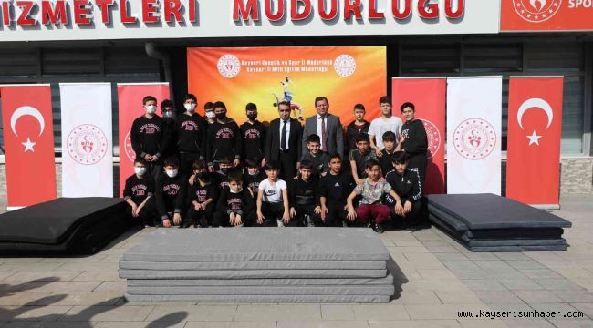 Gençlik ve Spor İl Müdürlüğü Spor Hizmetleri birimi önünde düzenlenen törende Gençlik ve Spor İl Müdürü Ali İhsan Kabakcı ile İl Milli Eğitim Müdür vekili Şemun Akman tarafından minderler okullara dağıtıldı. Protokol kapsamında ayrıca yılsonuna kadar ''38 Okula 38 Pota'' ve ''Tatemi Bizden Madalyalar Sizden'' projeleri kapsamında okullara malzeme dağıtımı yapılacak. Kayseri Gençlik ve Spor İl Müdürü Ali İhsan Kabakcı törende yaptığı konuşmada; "Bizim her şeyimiz çocuklarımız, sporcularımız, okullarımız. Okuldaki sporcularımıza Türkiye'de örnek olacak projeler gerçekleştiriyoruz. Minder, Tatami, Masa Tenisi Masası, Pota ve Satranç Masası olmak üzere bizim kendi atölyelerimizde yaptığımız spor malzemelerini alt yapısı olan tesisi olan okullarımıza bu malzemeleri kazandıracağız. Emeği geçen tüm mesai arkadaşlarımıza çok değerli Milli Eğitim Müdürümüz ve çalışma arkadaşlarına teşekkür ediyorum, inşallah okullarımız sporla coşacak bizlerde bu projeleri daha büyütüp geliştireceğiz" dedi.