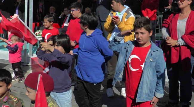 Kayseri'de 29 Ekim Cumhuriyet Bayramı dolayısıyla düzenlenen etkinliklerde, küçük çocuklar geçit töreni kortejini ellerinde bayraklarla asker selamı ile karşıladı.