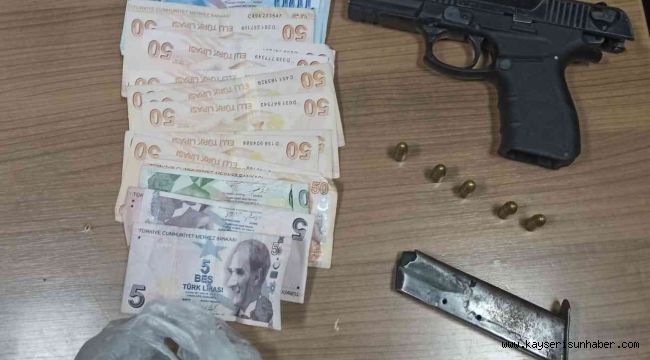 Kayseri İl Emniyet Müdürlüğü Asayiş Şube Müdürlüğü Motosikletli Polis Timleri Amirliği ekipleri tarafından şüpheli şahıslara yönelik şok denetim yapıldı. Melikgazi ilçesi Germir Mahallesinde yapılan denetimlerde; durumundan şüphelenerek durdurulan A.Y. 'nin(42) kaba üst kontrolünde ruhsatsız tabanca, tabancaya ait bir adet şarjör, 5 adet dolu fişek, 2 bin 590 TL para ve iki parça halinde aliminyum folyo ile 34.69 gram uyuşturucu madde ele geçirildi.