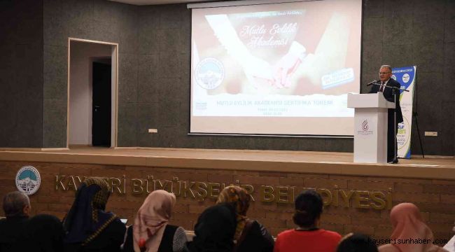 KAYMEK A.Ş. Huzur Çınarı Aile Danışmanlık ve Rehberlik Merkezi tarafından 'Mutlu Evlilik Akademisi' eğitim programı düzenlendi. Dört haftalık eğitimleri kapsayan 'Mutlu Evlilik Akademisi'nde katılımcılara evlilik kurumunun sağlıklı bir şekilde kurulması, sürdürülebilmesi ve evlilik öncesi gibi konularda eğitimler verildi. Dört haftanın sonunda Besime Özderici Engelsiz Yaşam Merkezi Konferans Salonu'nda sertifika töreni gerçekleştirildi. Törene Büyükşehir Belediye Başkanı Dr. Memduh Büyükkılıç, Genel Sekreter Yardımcısı Serdar Öztürk, İşletmeler ve İştirakler Daire Başkanı Cenani Ayaydın, Aile ve Sosyal Hizmetler İl Müdürü Cüneyd Özdemir, eğitmenler, katılımcılar ve aileleri katıldı. Mutlu Evlilik Akademisi, Evlilik Öncesi Eğitim Programı Kapanış Töreni'nde konuşan Başkan Büyükkılıç, "Sevgili gençlerimiz işin özü muhabbettir. Severek almak, severek evlenmek, severek işinizi yapmak, severek çalışmak, her konuda sevginin işin içerisinde olduğu boyut olursa takdir edersiniz yük olmaz. Aksi takdirde yapılan her iş yük olur" dedi. Büyükkılıç, evlilik üzerine önemli nasihatlerde bulunarak, şöyle konuştu;
