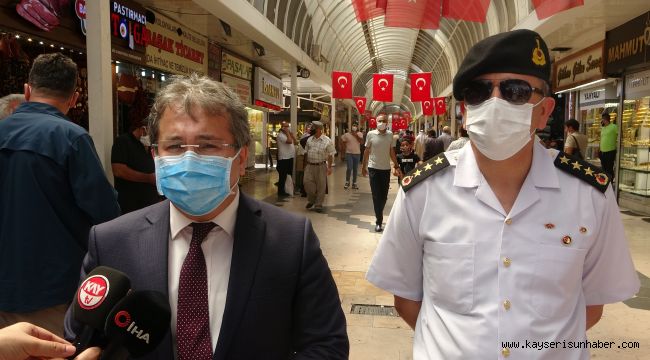 Tüm Türkiye'de olduğu gibi Kayseri'de de devam eden maske denetimine İl Sağlık Müdürü Doç. Dr. Ali Ramazan Benli ve İl Jandarma Komutanı Albay Nadir Çelik, birlikte çıktı. Kapalı çarşı ve Kazancılar Çarşısı ile 27 Mayıs Caddesi'nde maske denetimi gerçekleştiren İl Sağlık Müdürü Benli ve İl Jandarma Komutanı Çelik, maskesi olmayan vatandaşlara maske dağıttı ve maskeleri doğru takmayan vatandaşlara da uyarıda bulundu.