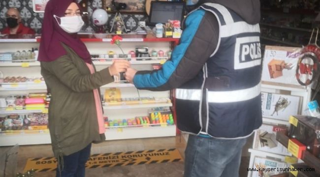 Kayseri'de polis ekipleri, 8 Mart Dünya Kadınlar Günü dolayısıyla kadınların gününü kutlayarak, karanfil hediye etti.