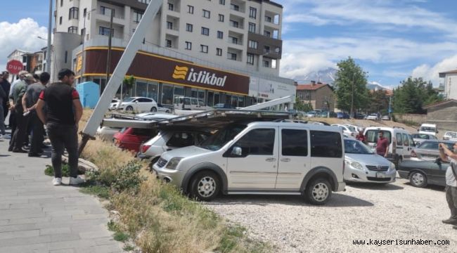 Kayseri'nin Develi ilçesinde park halindeki araçların üzerine reklam panosu düştü.