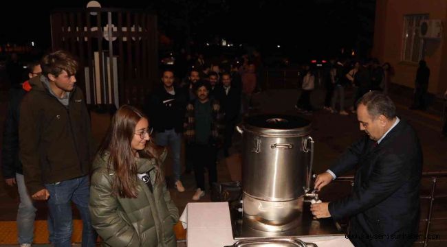 Erciyes Üniversitesi (ERÜ) vize haftası nedeniyle Merkez Kütüphane'de geç saatlere kadar ders çalışan öğrencilere sıcak çorba ikramında bulunurken, Rektör Prof. Dr. Fatih Altun, kütüphaneyi ziyaret ederek, öğrencilerle bir araya geldi.
